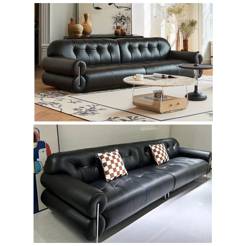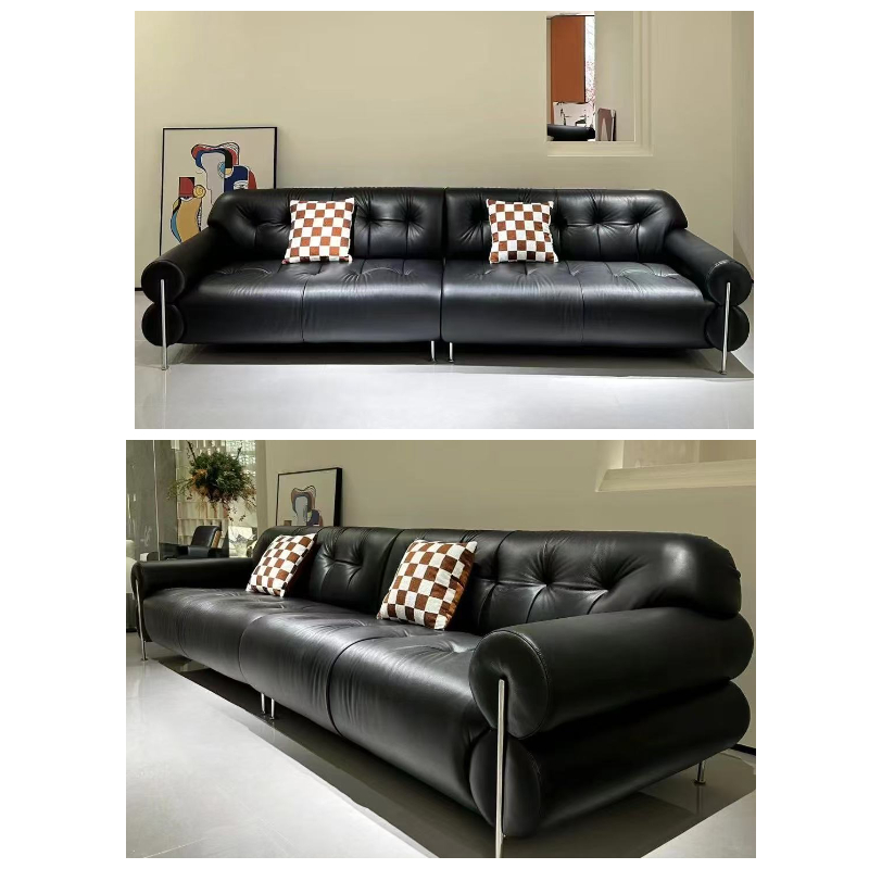 Its color is like rich brown sugar, unique and high - end, exuding a sense of luxury and instantly enhancing the style of the living room. The style is simple and fashionable, with smooth lines. The plump and round shape is like a soft cloud. The armrests are designed in a circular shape. The cylindrical high - density rebound sponge is fixed with polished mirror - finish original - color 304 stainless - steel hardware, combining softness and a sense of design. The side of the sofa is equipped with a 28mm - diameter round - tube stainless - steel, which not only ensures a sense of security but also has a beautiful sense of line. There are also high - leg and low - leg versions to meet different aesthetic needs. The back of the sofa is designed with a whole piece of leather, making it eye - catching even when placed in a transverse hall.